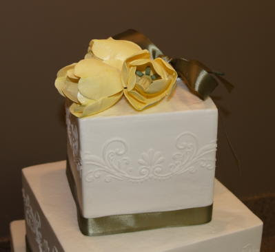 The bow was satin, and the brooch was costume jewelry purchased by the bride. At the time that I made the cake, I had no idea what those flowers were, so I just tried to copy them as closely as I could with the materials I had available to me. Liz has since told me that they are Christmas roses, and there is a cutter set available for them. Good to know for next time!